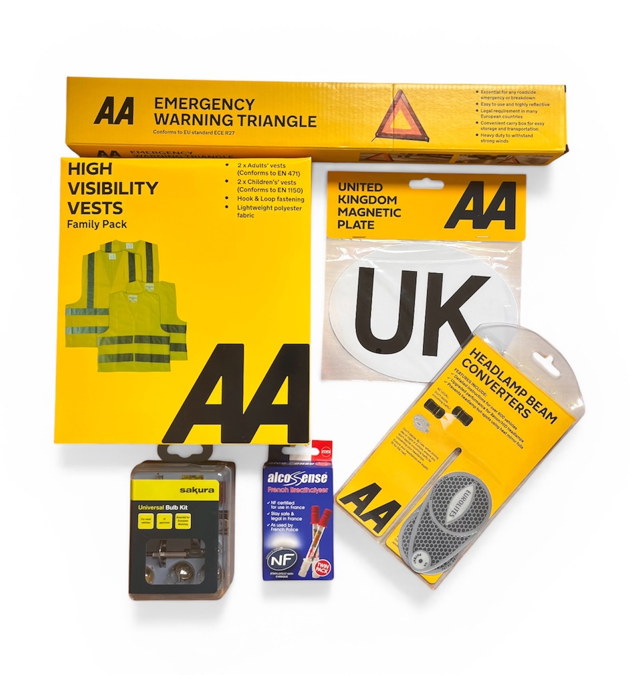 A neat premium branded set of all the products you need to stay safe and the right side of the law when travelling by car on mainland Europe.